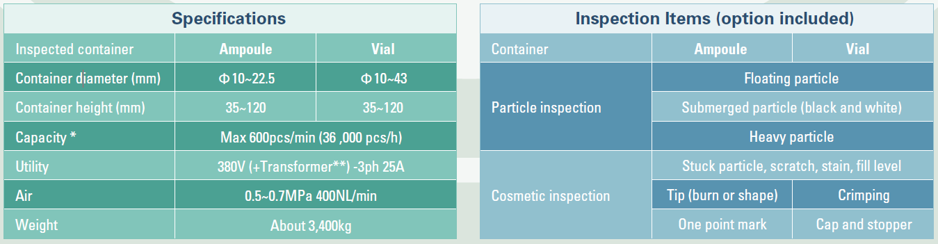 (2)Inspection rotor ? Inspection accuracy with high resolution area sensor ? Dual optical system to detect black and white particles ? Short flash strobe lighting to inspect amber colored products ? Accurate and various spin control with direct spin motor ? Precise oscillating technology | ||