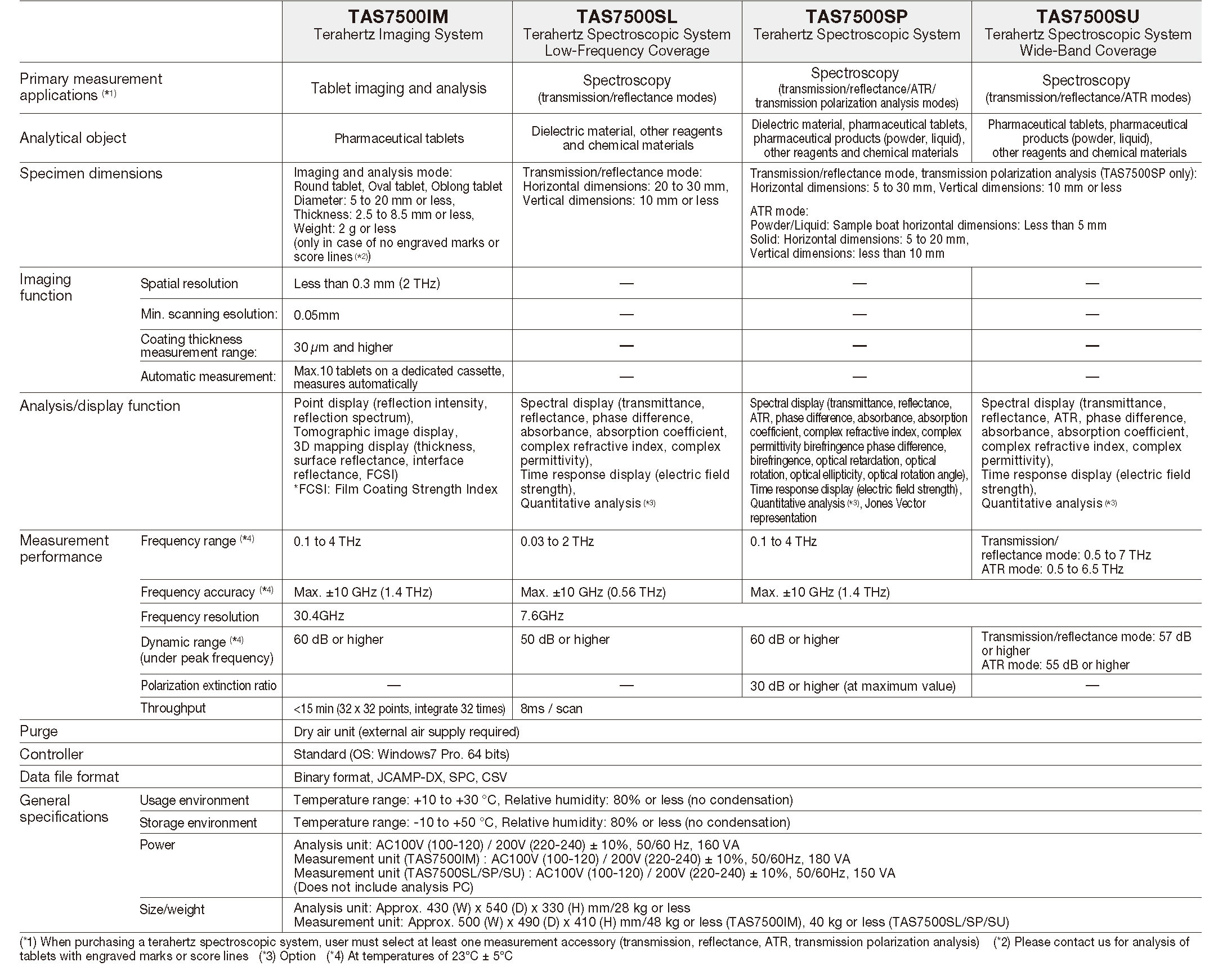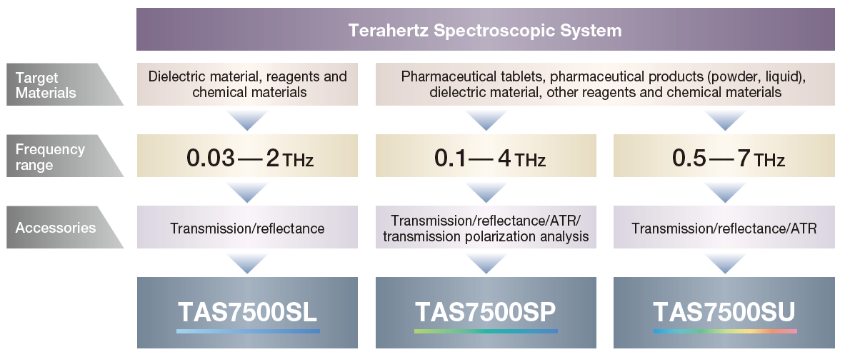 The TAS7500 series of high-speed, multifunctional analysis systems that perform spectroscopy and imaging by utilizing terahertz (THz) waves. Featuring easy operation and high-speed analysis, the systems enable non-destructive analysis of chemical samples, industrial products, materials for advanced communications and other substances, without complicated operation, as required by older terahertz analysis equipment. Utilizing Advantest’s high-performance sampling detection technology, the TAS7500 series is ideally suited not only for routine analysis, but also for use in R&D projects thus extending the practical use of terahertz technology.