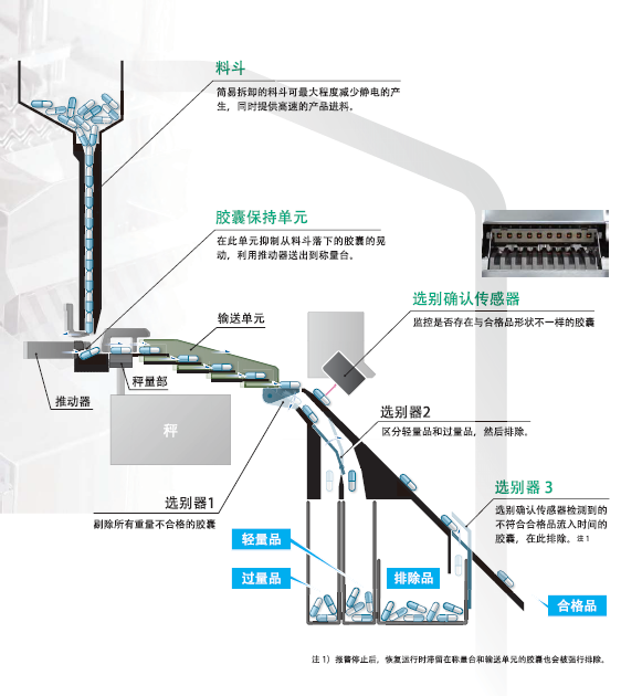 (3)監(jiān)控和跟蹤裝置內(nèi)的全數(shù)膠囊 通過3個(gè)選別器排出重量不合格的膠囊 | |